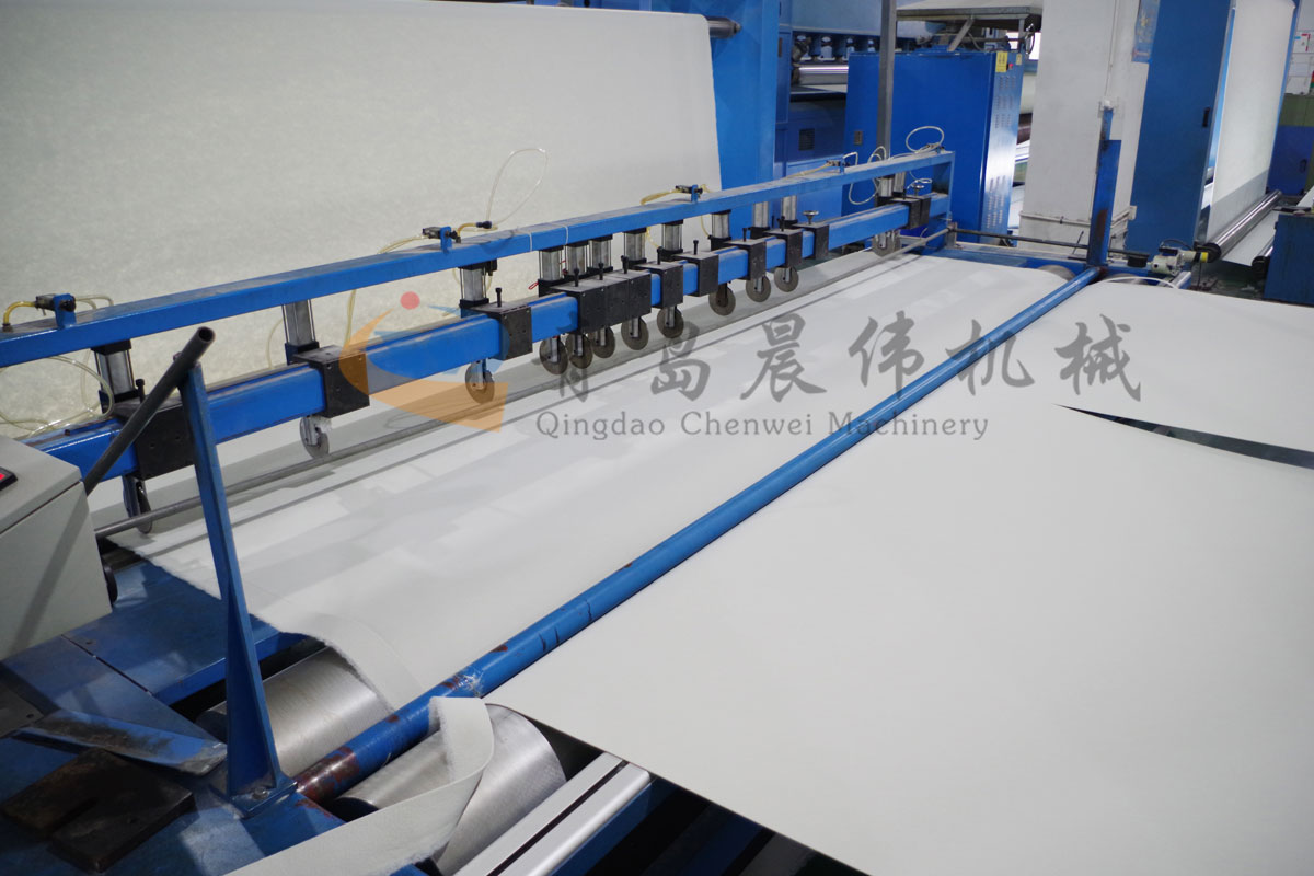 5. CWPW-鋪網(wǎng)機(jī):用于將梳理纖網(wǎng)通過移動(dòng)小車交叉折疊為所需幅寬和定量的多層纖網(wǎng),以供后道工序使用。鋪網(wǎng)輥采用特殊結(jié)構(gòu),加裝壓網(wǎng)輥和導(dǎo)流板,不飄網(wǎng)不起皺,五只大功率電機(jī)精確控制各部件的運(yùn)動(dòng),電動(dòng)輸出簾高度調(diào)節(jié)裝置